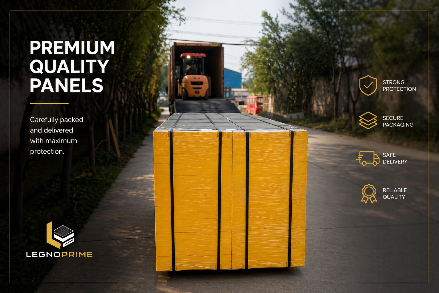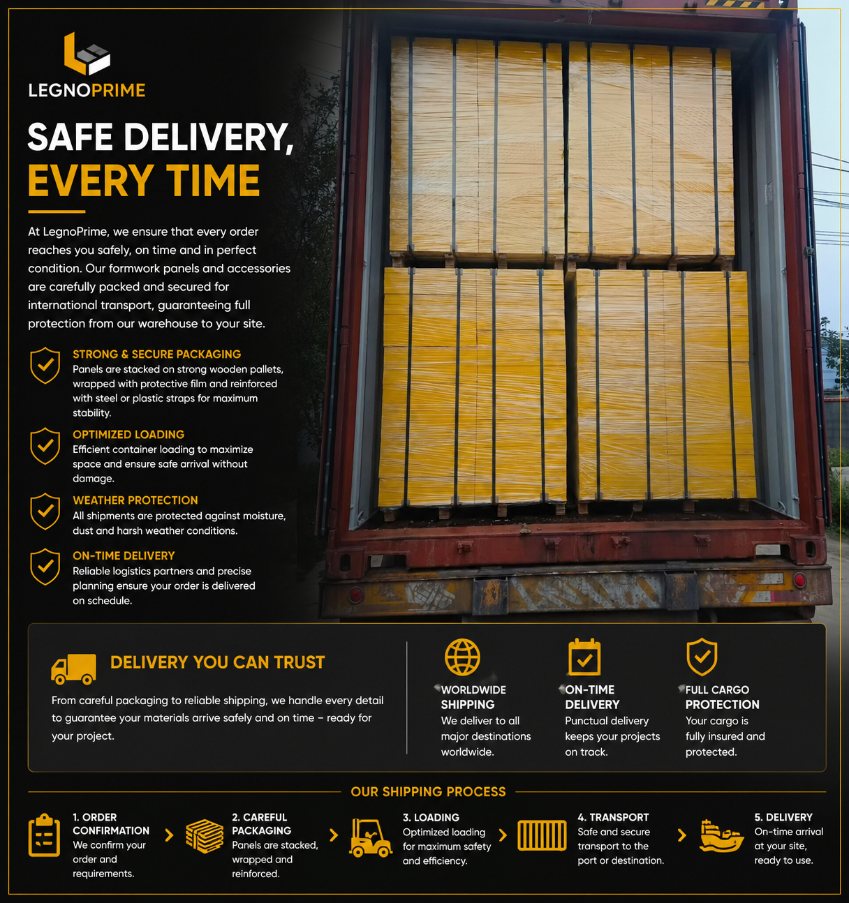 At LegnoPrime, we ensure that every order reaches you safely, on time and in perfect condition. Our formwork panels and accessories are carefully packed and secured for international transport.