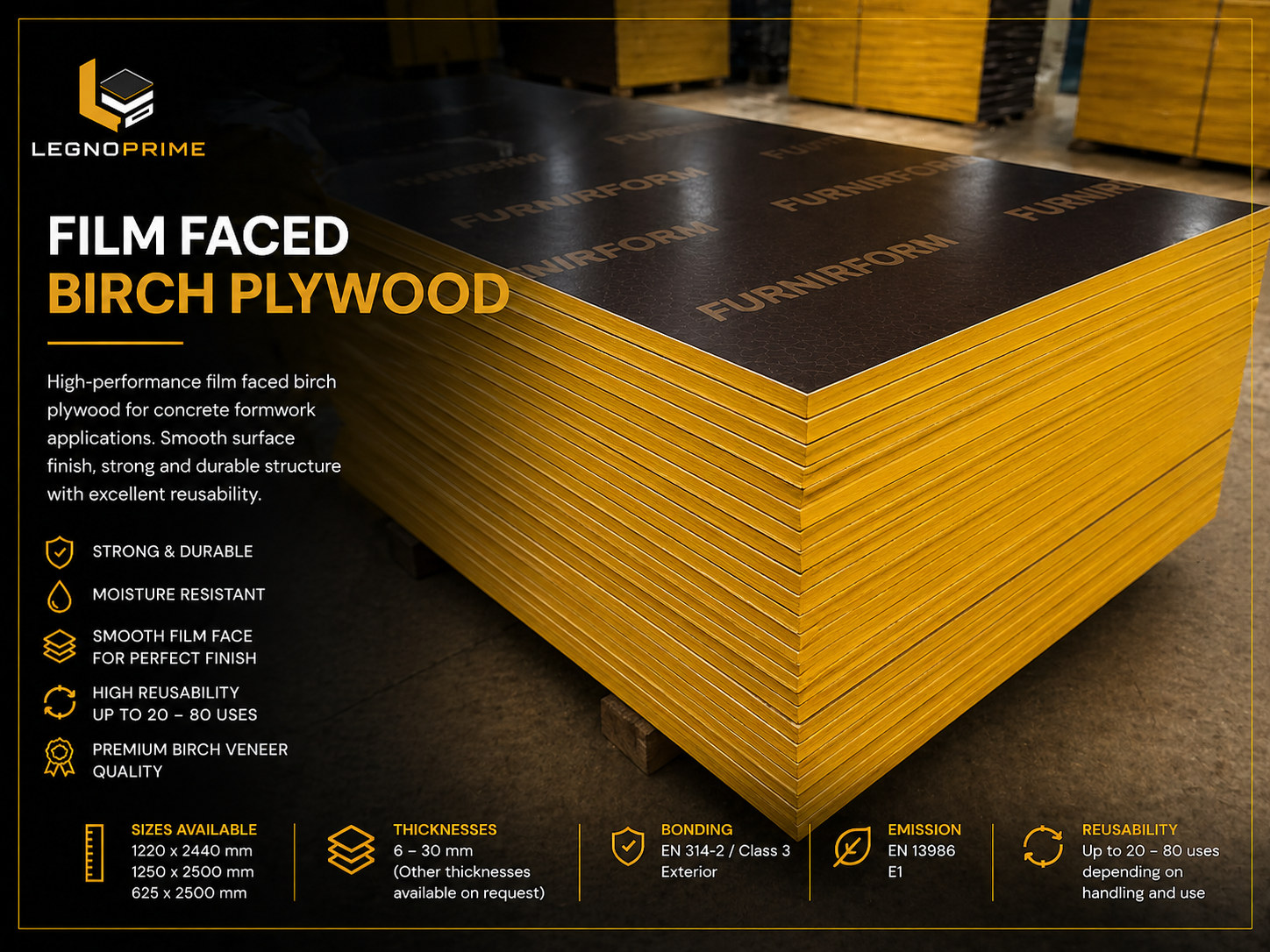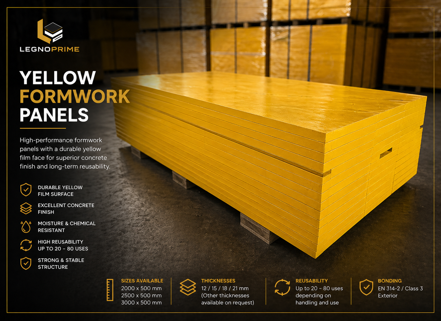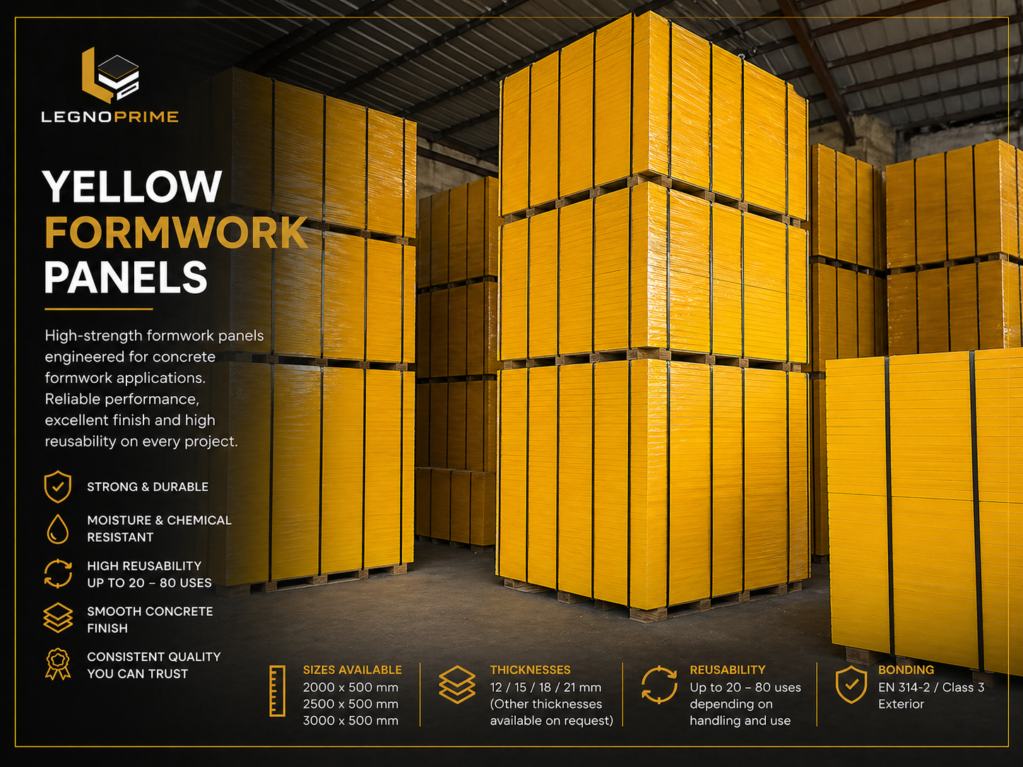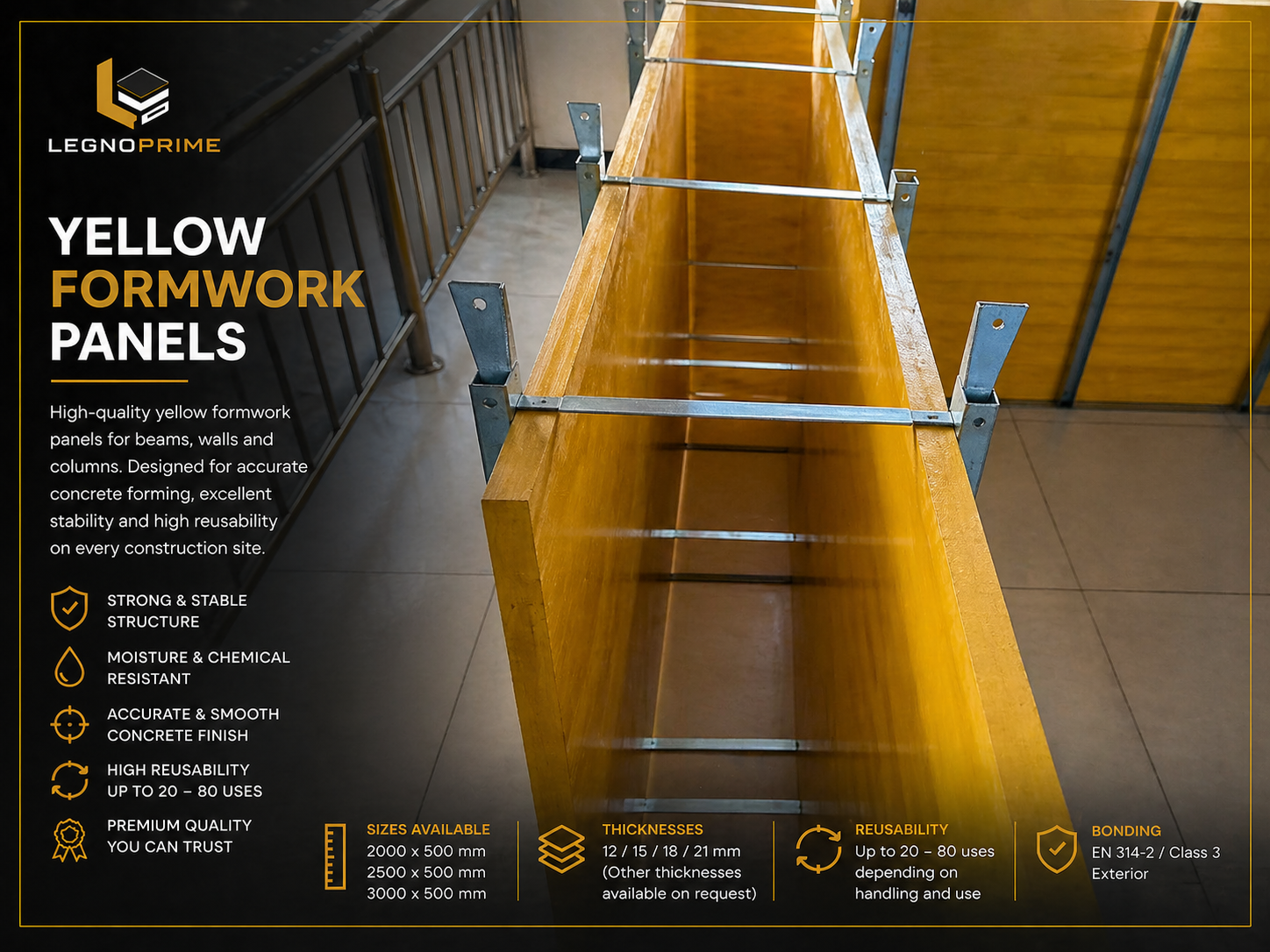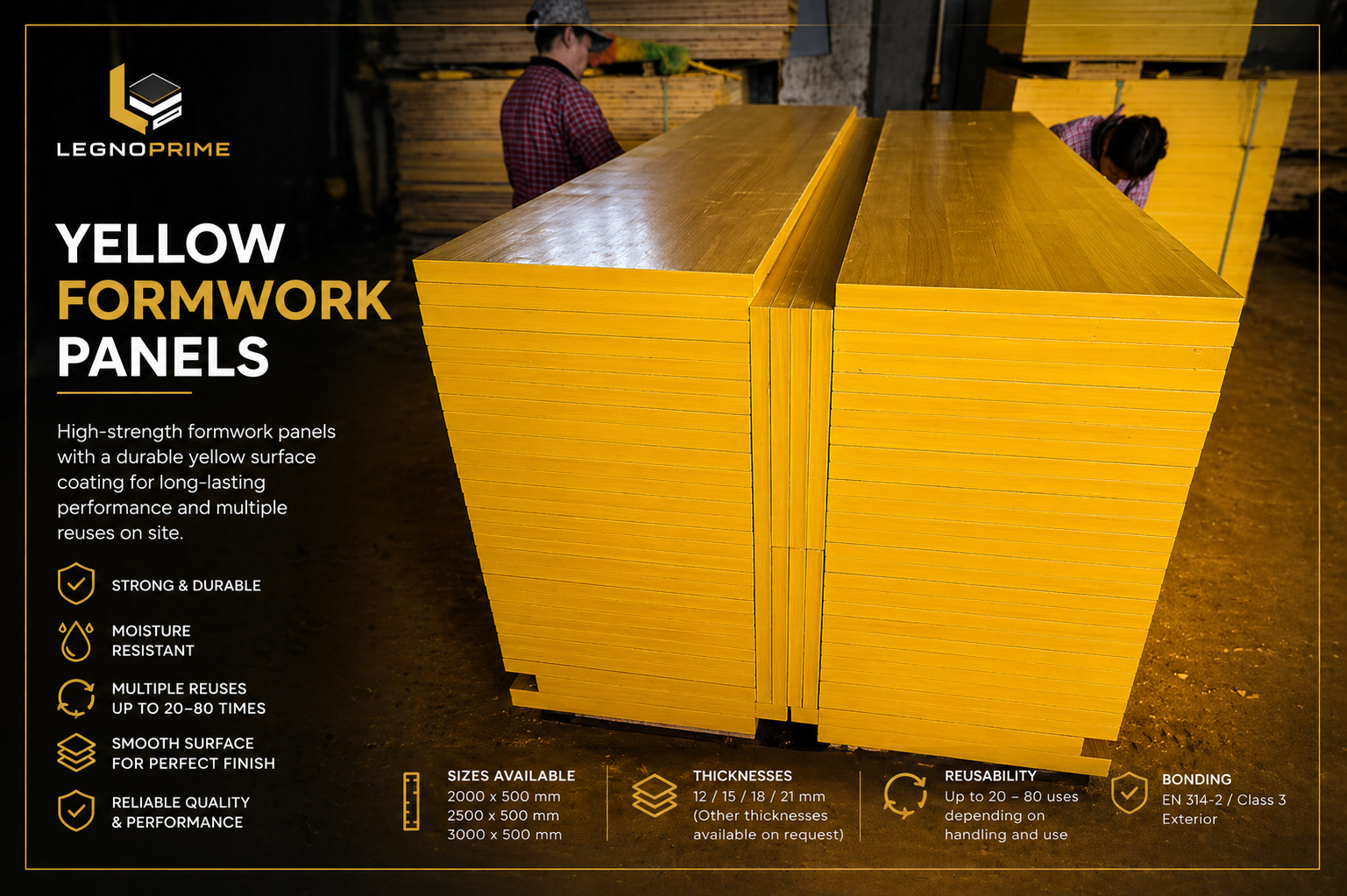 High-performance formwork panels with a durable yellow film face for superior concrete finish and long-term reusability.